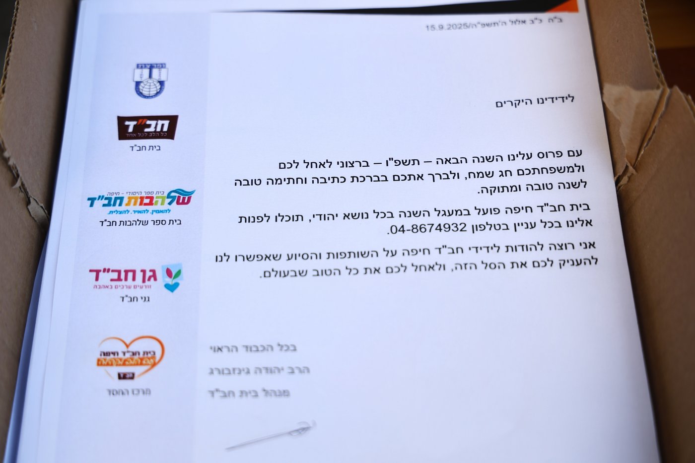כמידי חג בית חב”ד חיפה מחלק למאות משפחות בחיפה אוכל לחג, שליח הרבי ומנהל חב״ד חיפה הרב יהודה גינזבורג: בהוראת הרבי אנחנו דואגים לא רק בפסח אלא גם בר”ה למאות משפחות בחיפה מכל המגזרים לאוכל בסיסי לחגים, כמצווה ‘אכלו משמנים ושתו ממתקים ושלחו מנות לאין נכון לו’, השנה גברו הביקושים בעקבות יוקר המחיה ואנחנו מודים לכל החברות והפרטיים ששותפים איתנו.