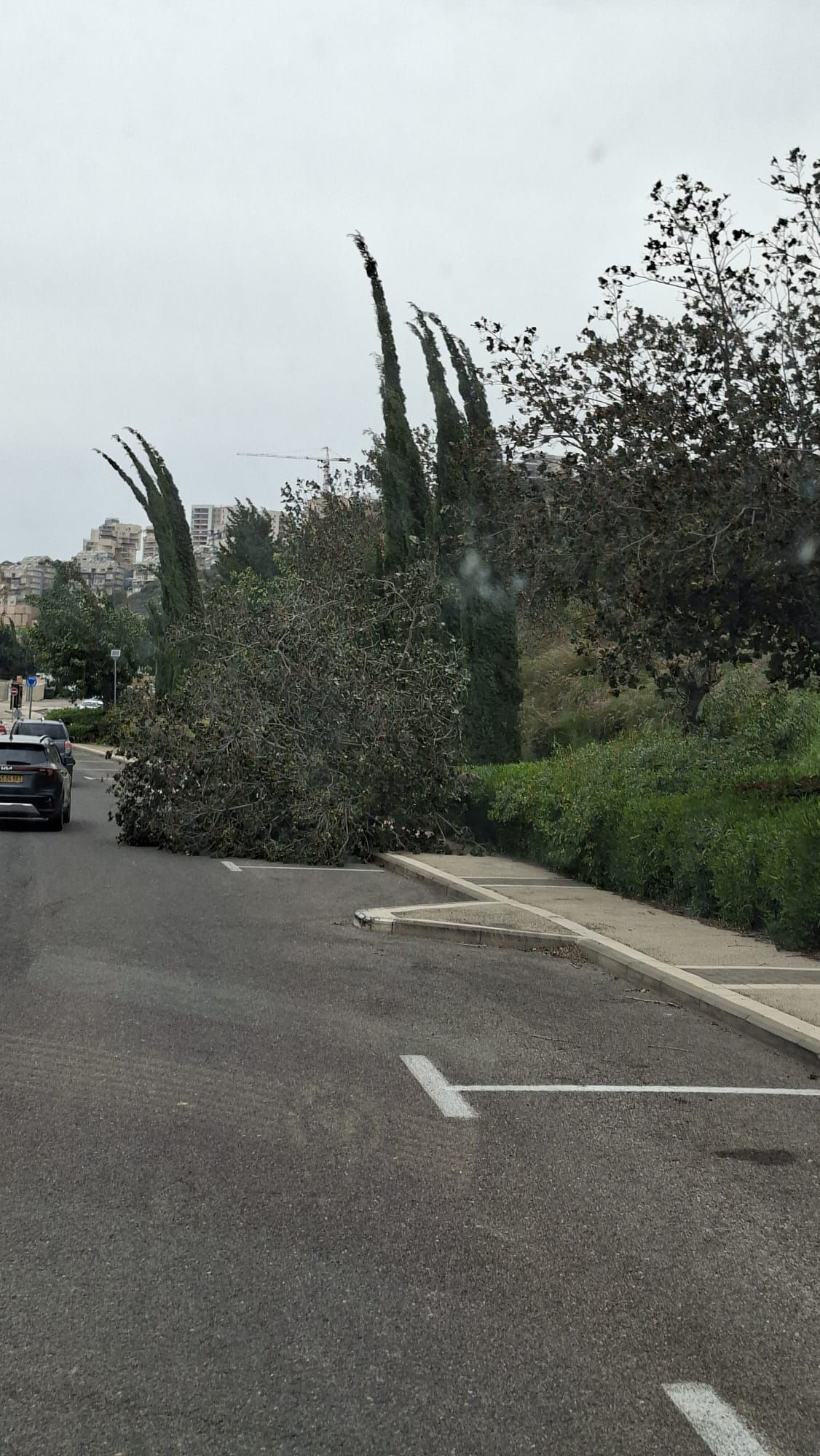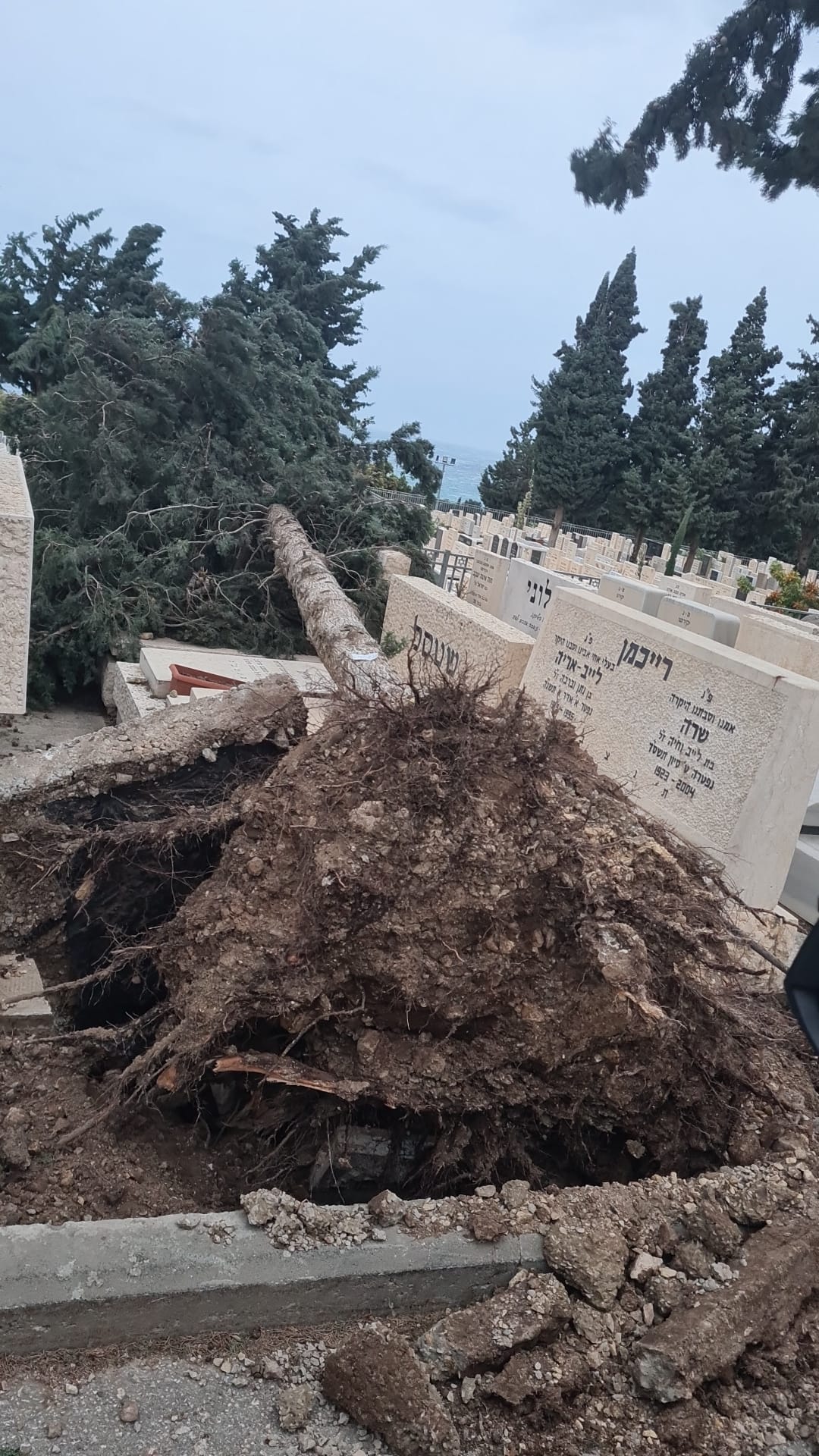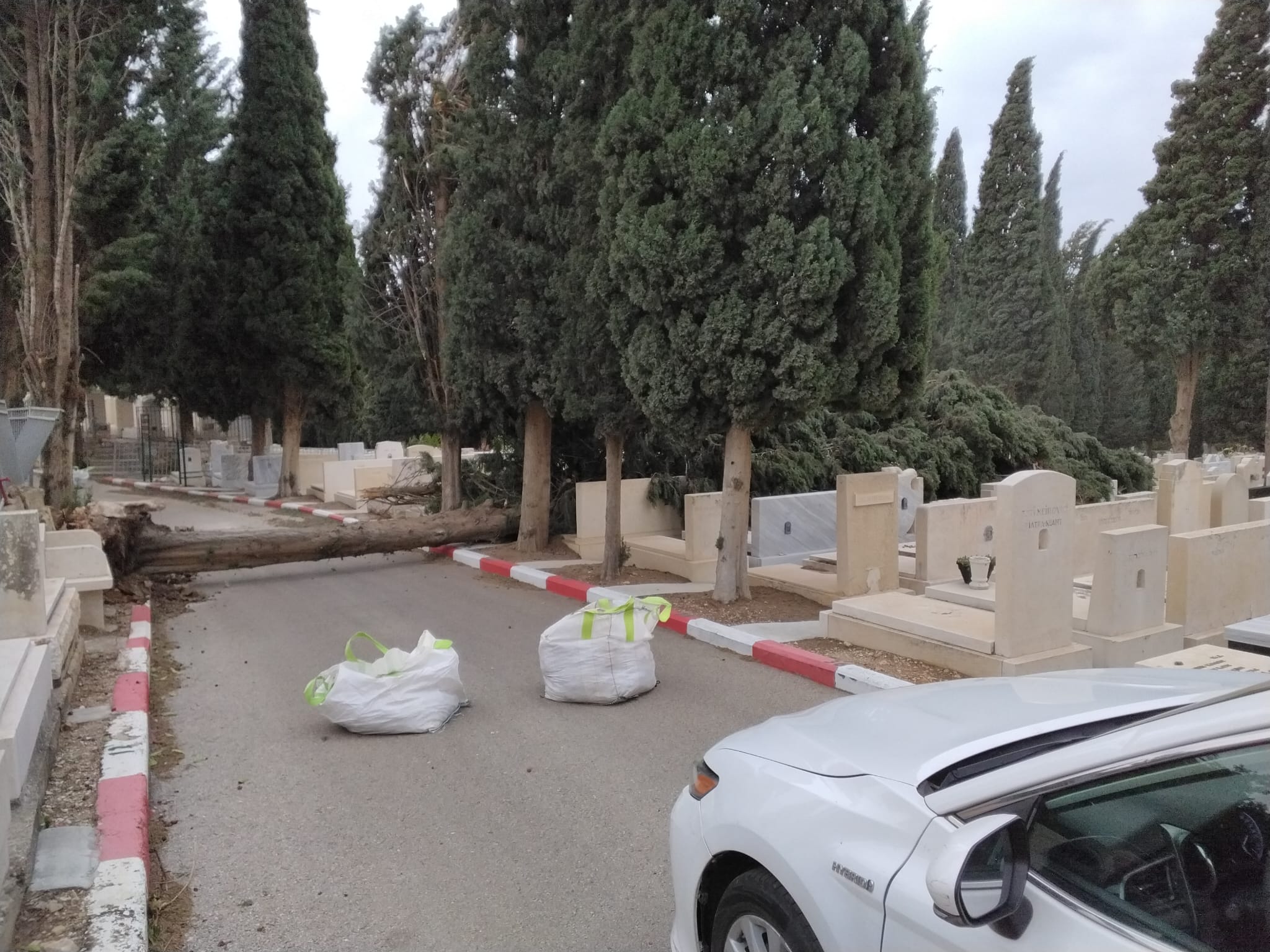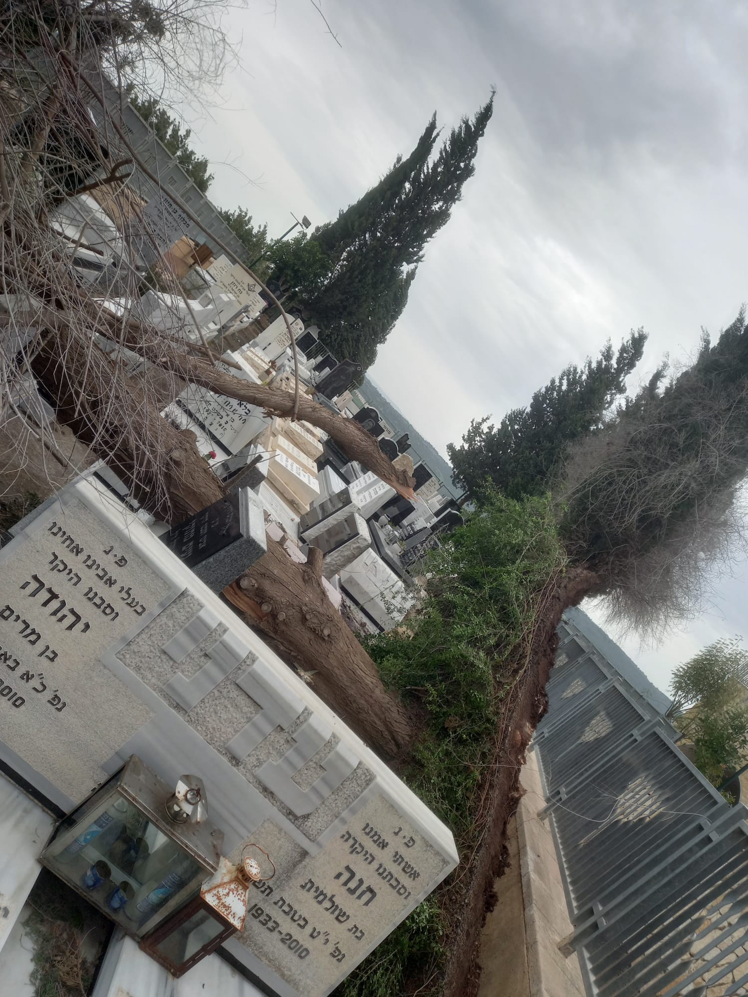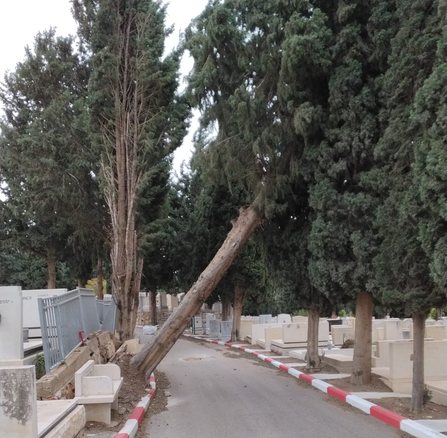 הרוחות החזקות לא פוסחות על בית העלמין, שם קרסו חמישה עצים משעות הבוקר (חמישי). תחילה קרס עץ ברוש בחלקה שבשער ברוש. העץ בגובה עשרות מטרים קרס על מצבות ונזק נגרם למספר מצבות.