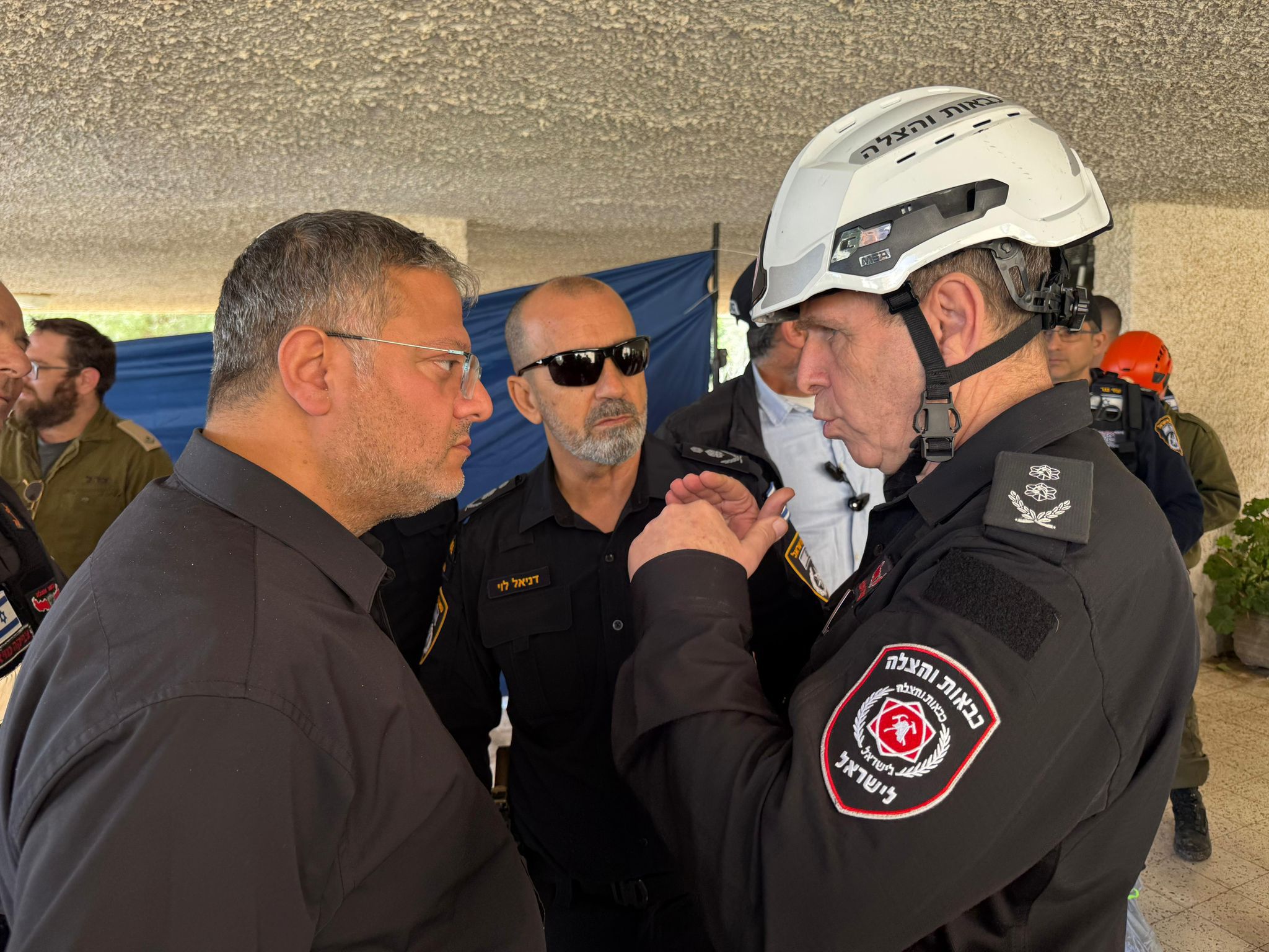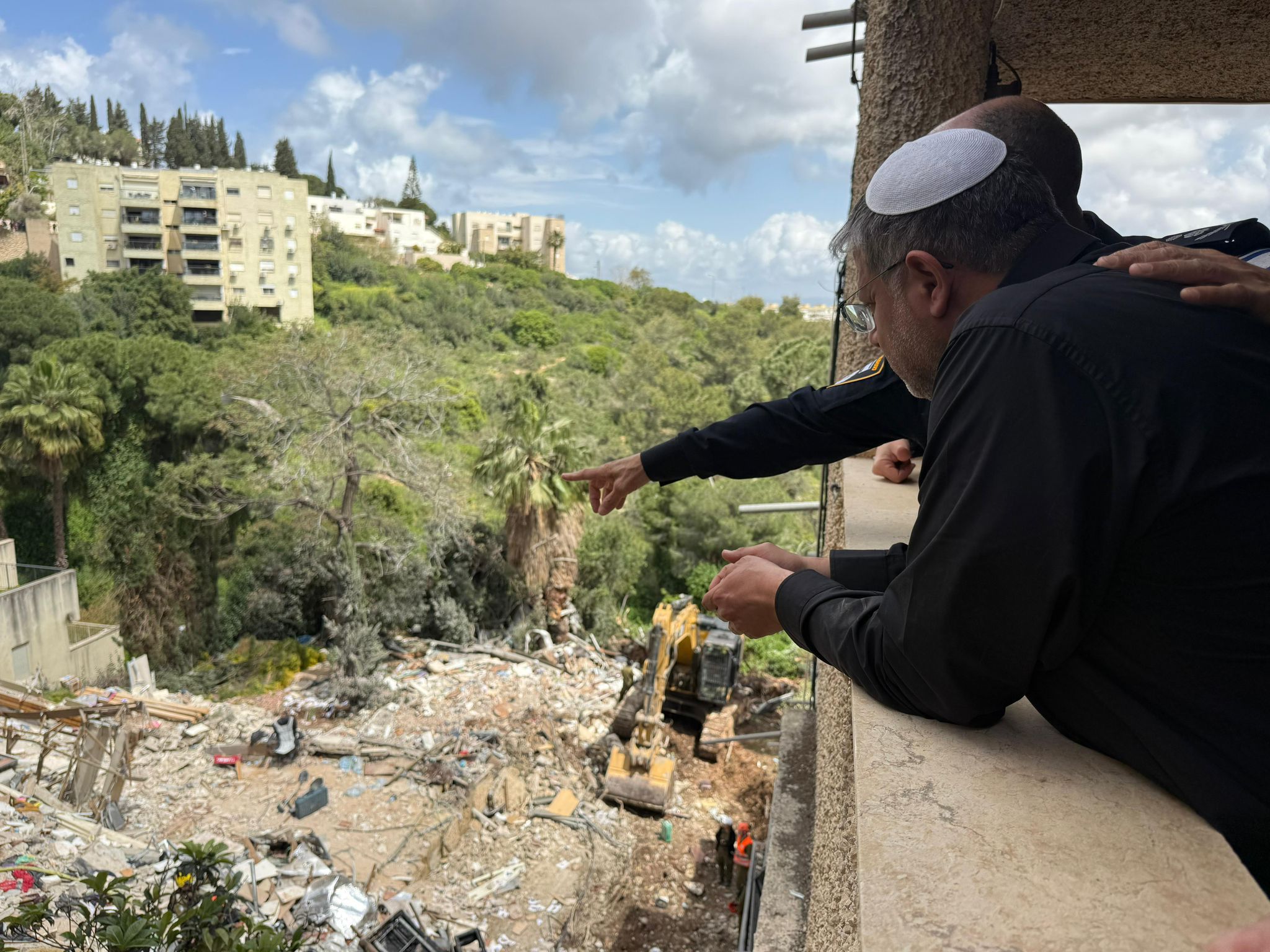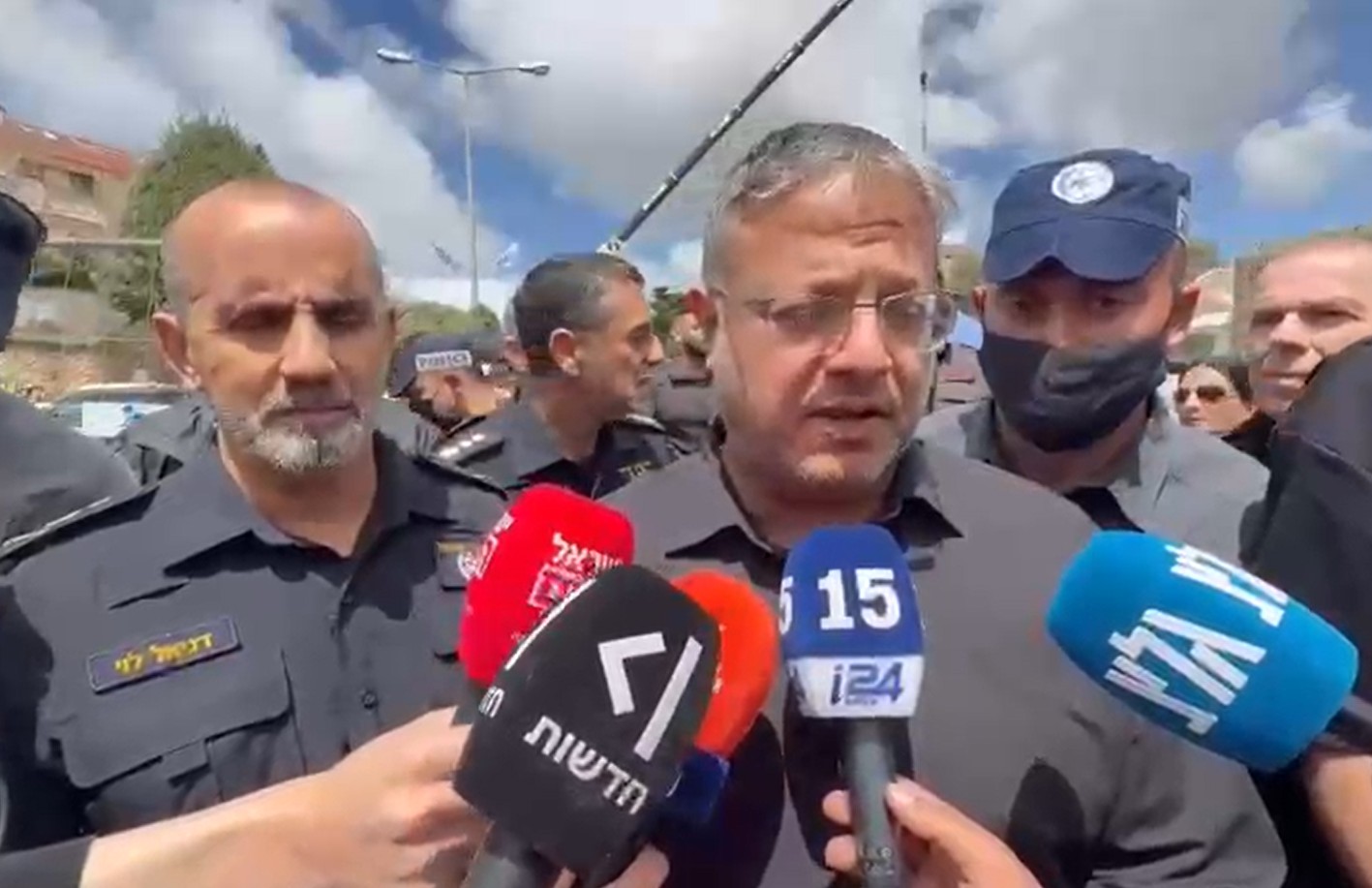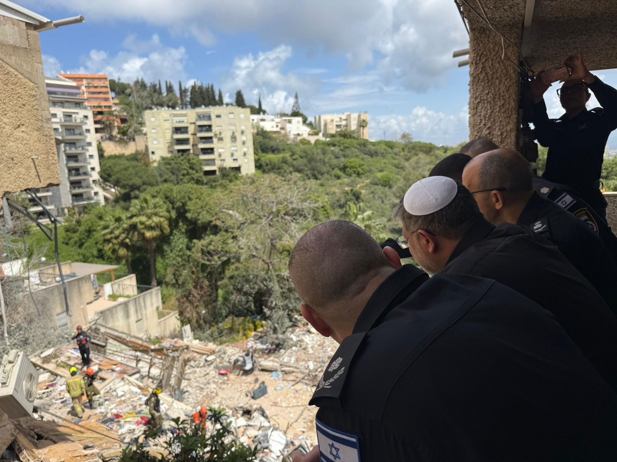 השר לביטחון לאומי איתמר בן גביר, בזירת הנפילה בחיפה, יחד עם מפכ״ל המשטרה רב-ניצב דני לוי ונציב כב״ה רב-טפסר אייל כספי: “הכאב לא פשוט, מצד שני יש כאלה מחפשים כל מיני אסטרטגיות של איך יוצאים – אני בעד אסטרטגיית ניצחון, אנחנו מנצחים את האיראנים, צה״ל שלנו עושה עבודה נפלאה. צריך להגיד תודה לראש הממשלה, לשר הביטחון, למוסד ולמשטרה שעושה פה עבודה מעולה, לשוטרים הגיבורים שלנו, לפיקוד העורף לכבאות והצלה שמצילים חיים של אנשים. אנחנו קוראים מכאן לאנשים תקפידו על ההוראות – חדרי מדרגות זה לא מספיק, מי שיש לו מקלט או ממ״ד שיילך, חדר מדרגות לא מספיק.