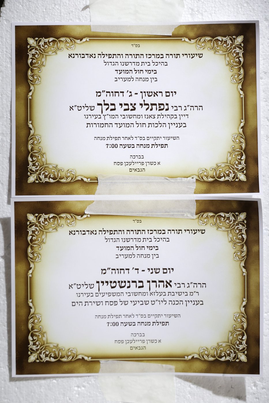 בימי חול המועד נמסרו שיעורי תורה רבים בביהמ”ד נאדבורנא ובעלזא ביניהם מפי הרב אברהם דרברמדיקר שליט”א והרב אהרן שטיינברג שליט”א דייני בי”ד ‘הישר והטוב’, אב”ד צאנז נתניה שליט”א מסר שיעור בבעלזא ולאחמ”כ התפלל תפילת מעריב בביהמ”ד צאנז, הרב נפתלי צבי בלך שליט”א דיין בקהילת צאנז ומו”ץ, הרב אהרן ברנשטיין שליט”א ר”מ בישיבת בעלזא ועוד. לא ניתנו מועדים לישראל אלא כדי שיעסקו בתורה.